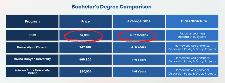 Our mission is to provide a quality education while saving you time and money. Traditional college classes require lectures, expensive textbooks, homework, assignments, discussion posts, and group projects. SB1D uses strategy, innovation, and technology to deliver the most efficient pathway for earning a Bachelor Degree. Strategy is everything!