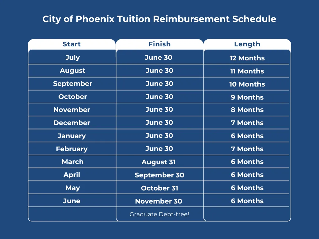 Yes, our goal is to help you use your City of Phoenix Tuition Reimbursement benefits so you can pay little or nothing out of pocket for your degree. To have the entire degree paid for by your benefits, you would pay $6500 in year 1, and on July 1st, you would use $1495 of your benefit to finish paying for your degree. This would allow you to earn your degree in 6-14 months (depending on the month you start) and pay zero out of pocket.
